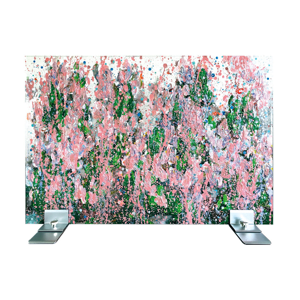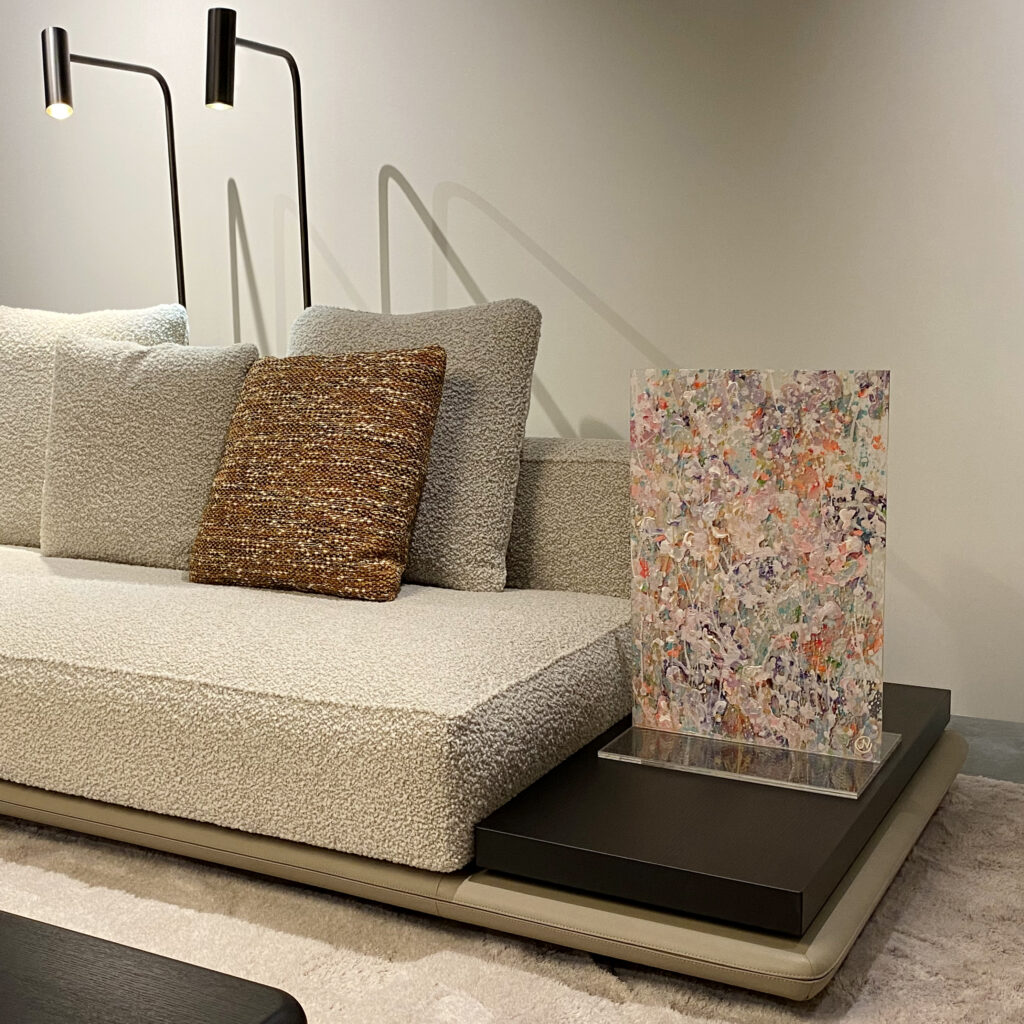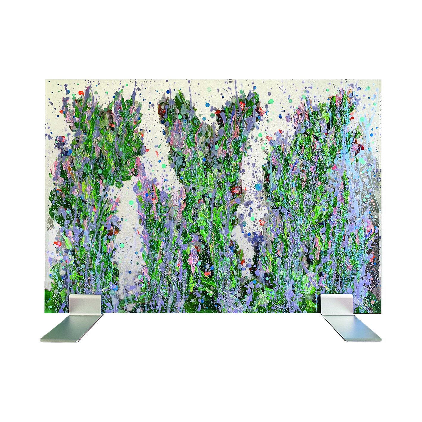 What makes the 360° paintings so special is their transparency. De Vet paints both sides of the plate, so that it is actually two paintings. No, four, because you can also see the back of both. This means that painting, no matter how free and spontaneous it may seem, must be done very thoughtfully. If she paints over a brushstroke with a different color, it still remains visible at the back. While painting, De Vet ensures the right balance between the two sides of the painting, and between light and dark tones, transparency and paint. Ultimately, this creates a work that you can wander over and through with your gaze, constantly discovering new details, color combinations, brush strokes and see through views.