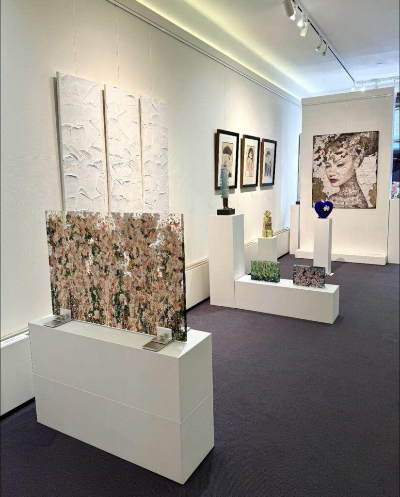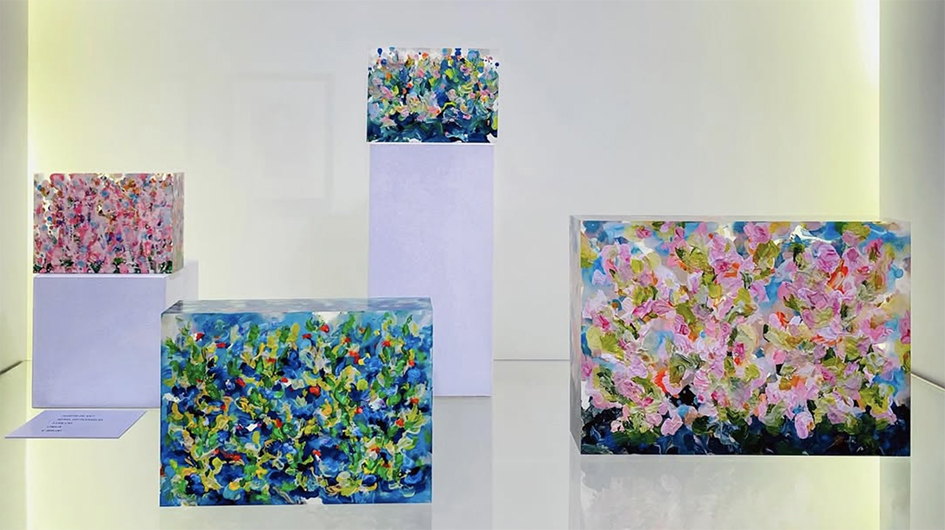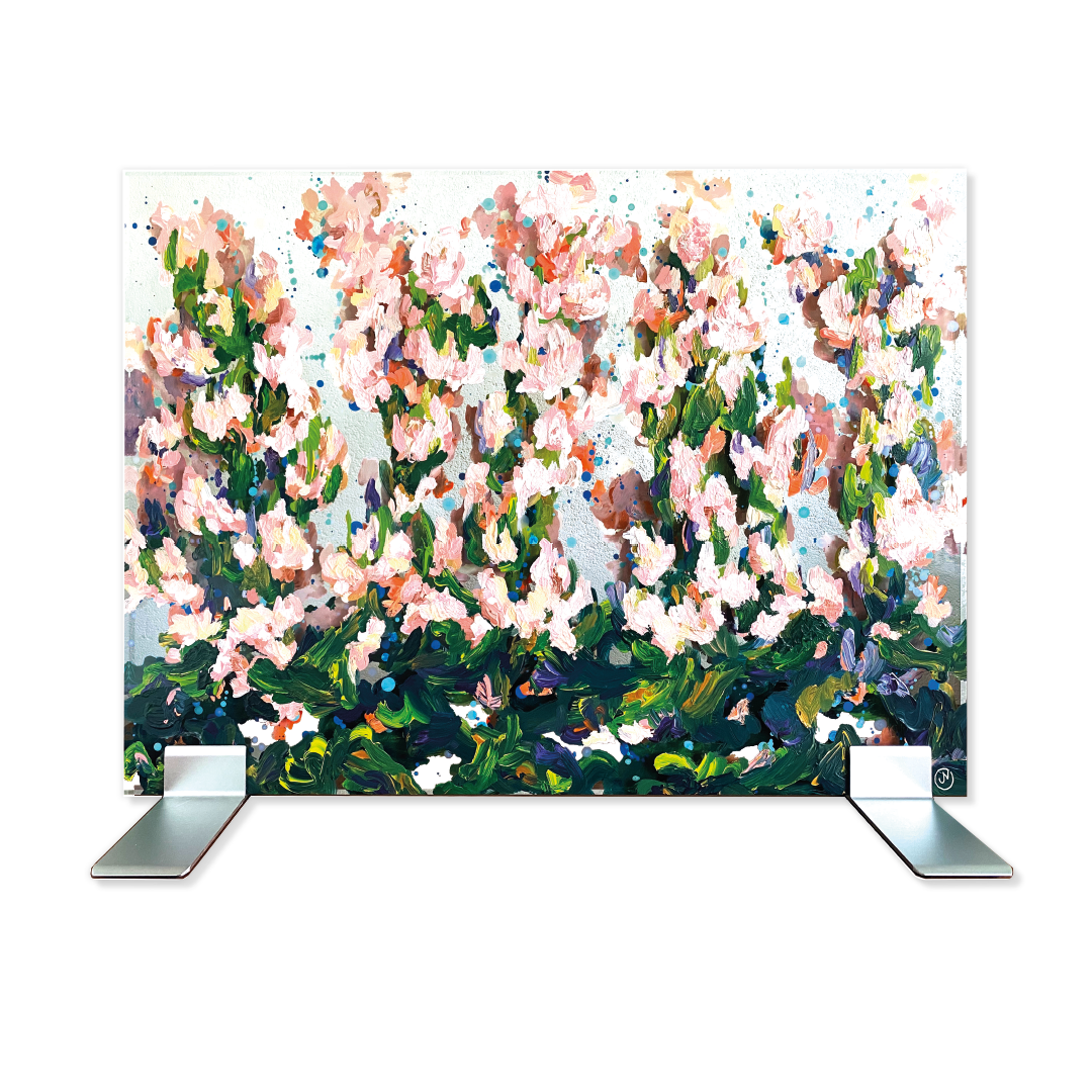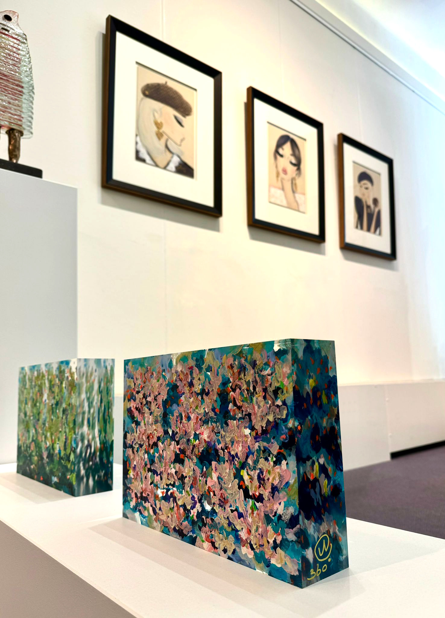 What makes the 360° paintings so special is their transparency. De Vet paints both sides of the plate, so that it is actually two paintings. No, four, because you can also see the back of both. This means that painting, no matter how free and spontaneous it may seem, must be done very thoughtfully. If she paints over a brushstroke with a different color, it still remains visible at the back. While painting, De Vet ensures the right balance between the two sides of the painting, and between light and dark tones, transparency and paint. Ultimately, this creates a work that you can wander over and through with your gaze, constantly discovering new details, color combinations, brush strokes and see through views.